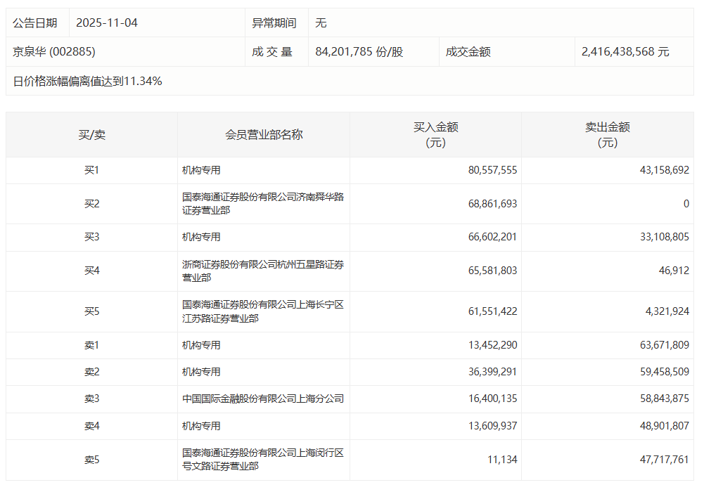 京泉华今日涨停,3家机构专用席位净卖出1.09亿元