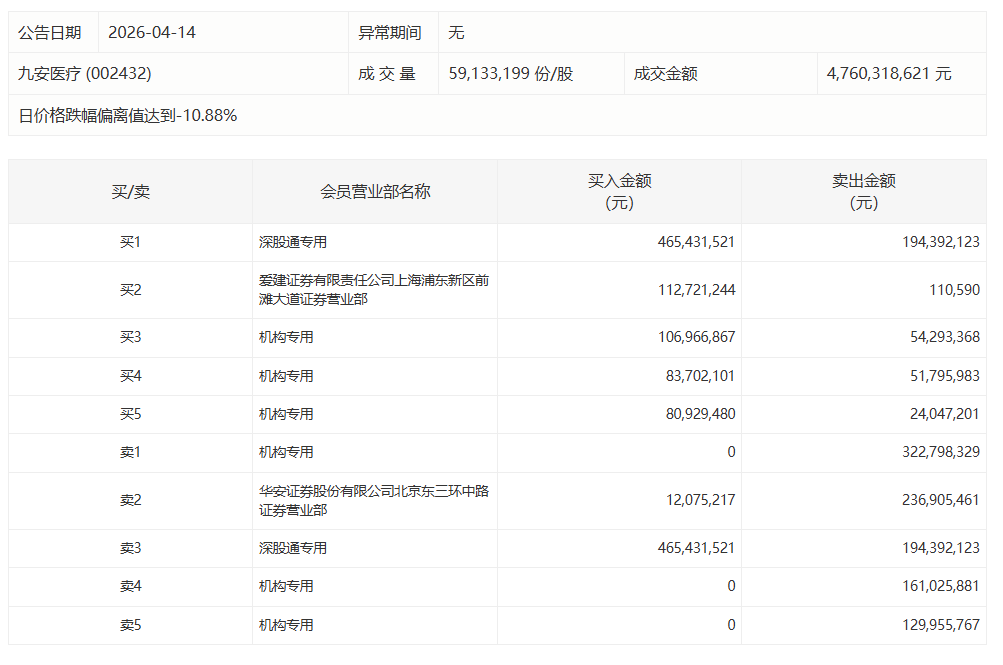 九安医疗今日跌9.46%,有3家机构专用席位净卖出6.14亿元