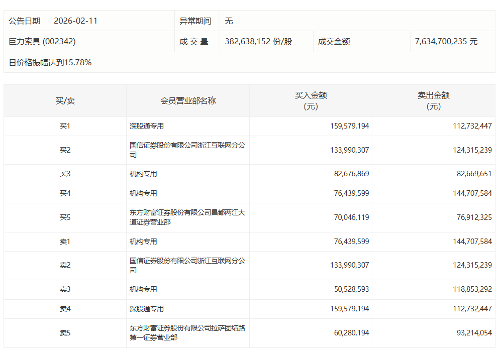 巨力索具今日涨7.94%,有2家机构专用席位净卖出2.79亿元