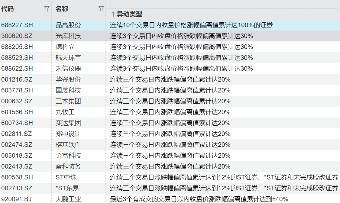截至9月25日,近日A股有14只个股连续异动2个交易日及以上。科思科技连续30个交易日内收盘价格跌幅偏离值累计达-70%。联合化学、中威电子、上纬新材等连续3个交易日内收盘价格涨跌幅偏离值累计达30%。山河智能、山河智能、七匹狼等连续三个交易日内涨跌幅偏离值累计达20%。ST景谷、*ST奥维、*ST万方等连续三个交易日涨跌幅偏离值累计达到12%。
