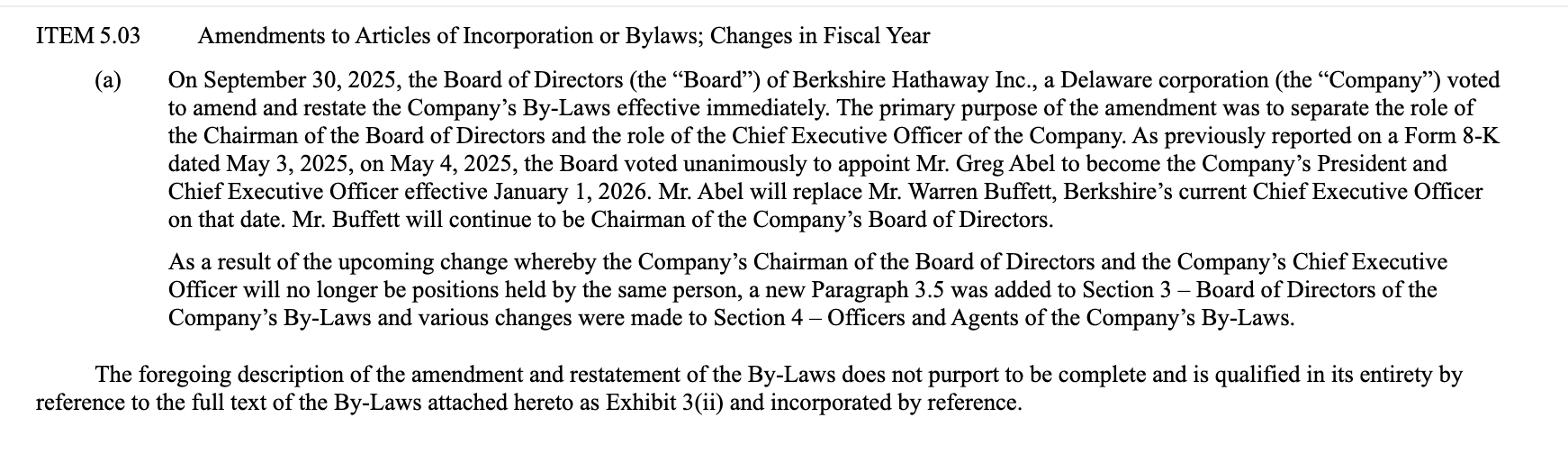 伯克希尔・哈撒韦修改公司章程,将董事长、首席执行官职位分开
