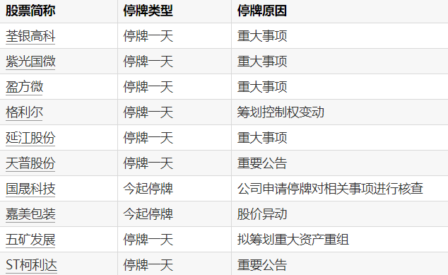 A股停牌提示:9股今日停牌