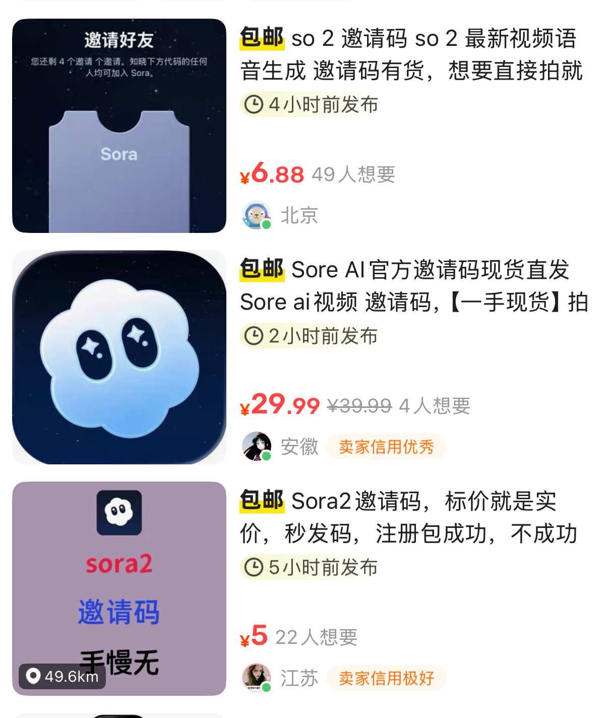 由于Sora采用邀请制免费使用,在国内,闲鱼上已经出现29.9元买邀请码的生意,不过单价6.88元的邀请码更受欢迎,界面显示已经有近50人想要。