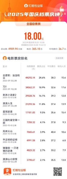 灯塔专业版实时数据显示,截至10月8日16时,2025年国庆档票房(含预售)突破18亿元,预计档期最终票房或不及去年同期创造的21.05亿元。