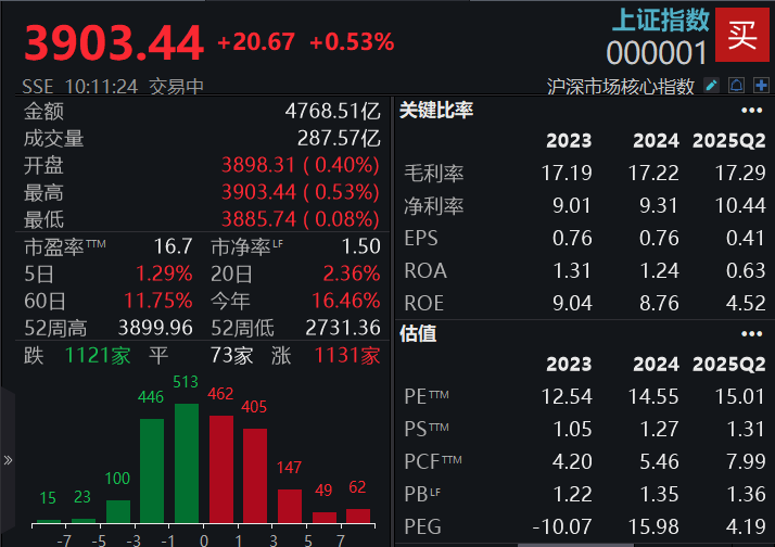 11:31 A股午盘|沪指时隔10年再度突破3900点