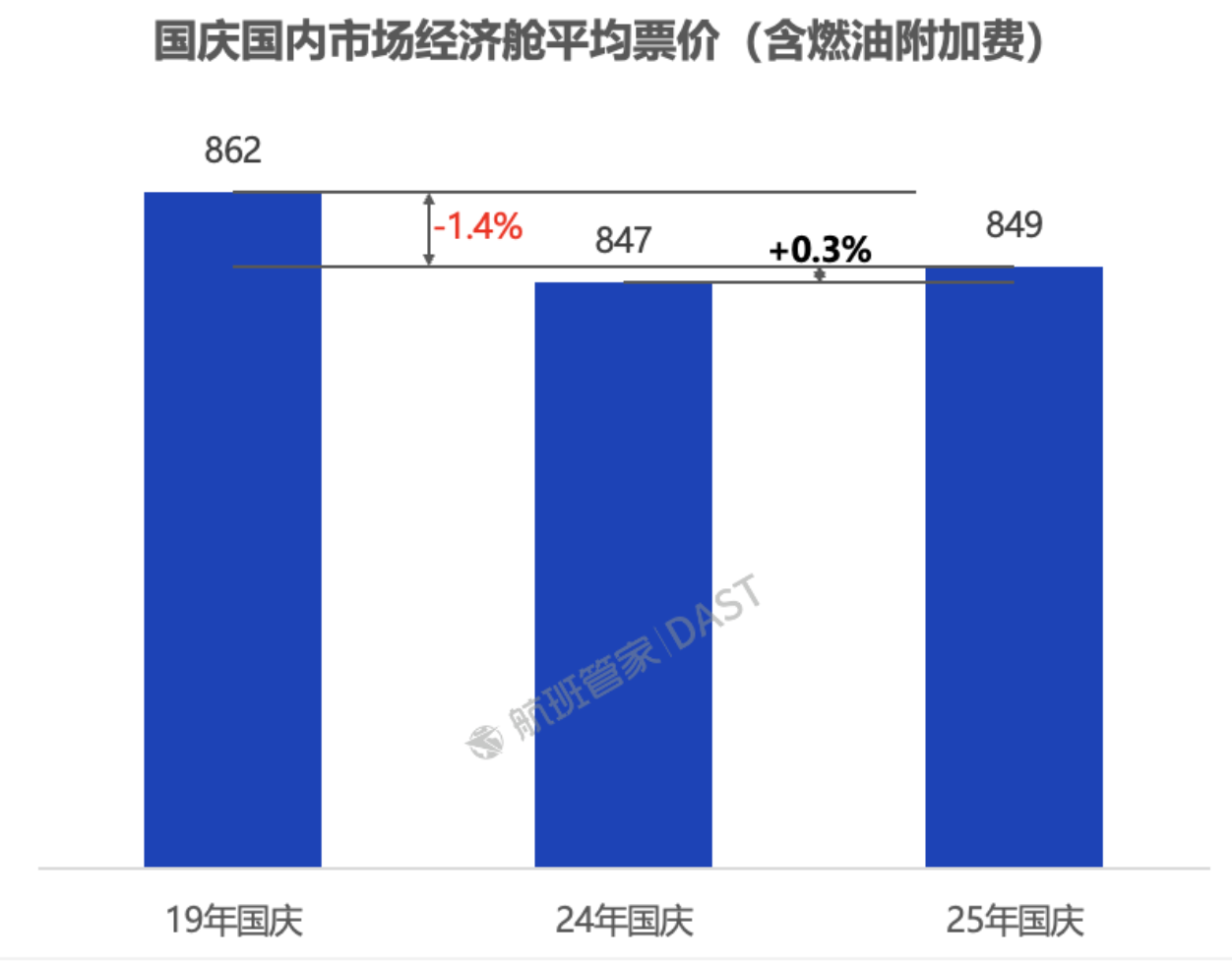 根据航班管家的统计,国庆假期的国内机票(经济舱)均价849元(含燃油附加费),同比2019年微降1.4%,同比2024年则微增0.3%。