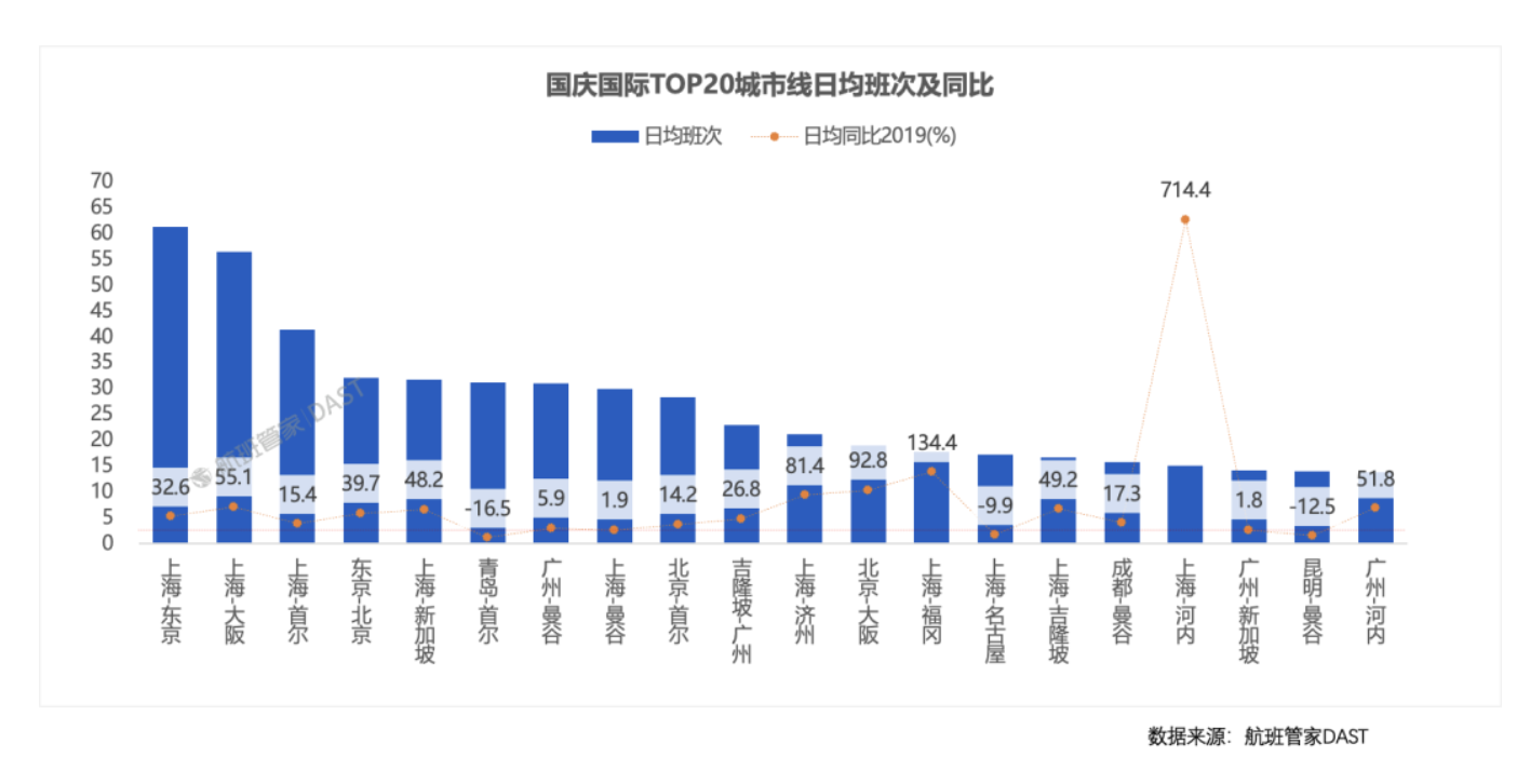航空公司也在加码国际运力的投放。国庆期间预计执行国际航班超1.6万班次,日均航班量恢复至2019年的92.9%,但TOP20国际城市线多数已经恢复并超过2019年水平,其中10条航线日均班次增幅超3成。