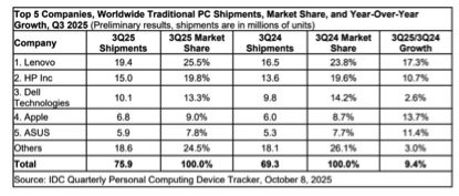 北京时间10月9日,国际数据公司(IDC)发布了《全球季度个人计算设备跟踪报告》初步数据,2025 年第三季度全球PC出货量同比增长9.4%,总出货量达 7580万台。