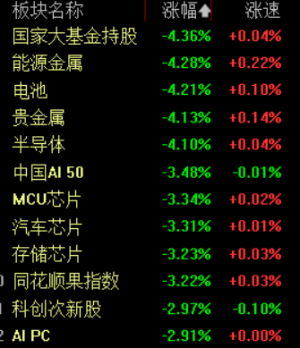 10:09 创业板指下挫跌逾3%,沪指跌0.43%,深成指跌1.59%,科创50指数跌近4%。贵金属、半导体芯片、新能源电池等方向跌幅居前,市场下跌个股近2500只。