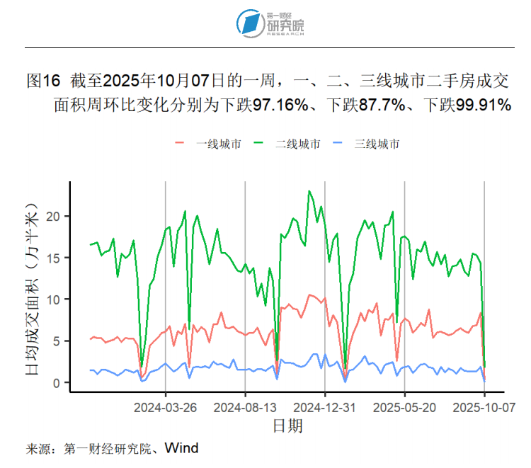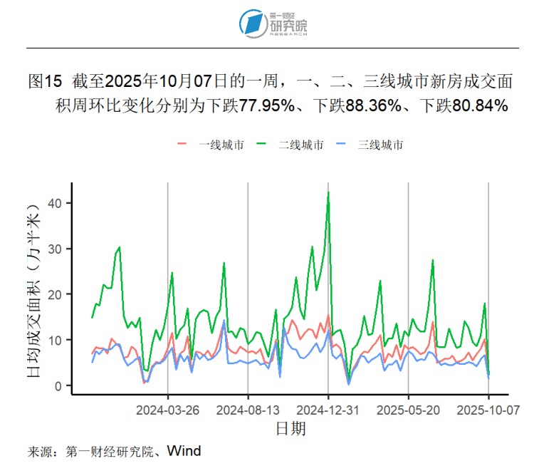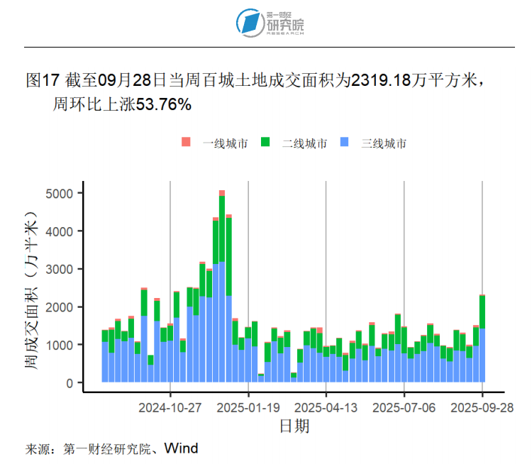 截至10月7日的一周中,新房方面,一、二、三线城市新房成交面积分别环比下降了77.95%、88.36%和80.84%。二手房方面,一、二、三线城市二手房成交面积分别环比下降了97.16%、87.7%和99.91%。本周,除一线城市新房及二线城市二手房外,其余房屋日均成交面积均低于去年同期水平。截至9月28日的一周,百城土地成交面积为2319.18万平方米,周环比上升53.76%。