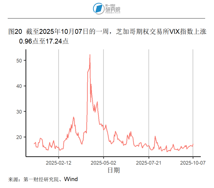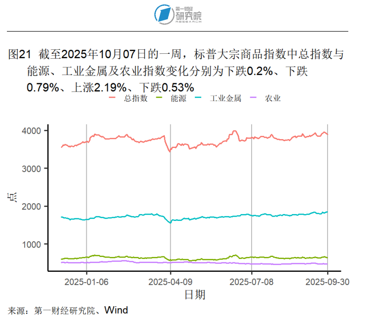 截至10月7日的一周,芝加哥期权交易所VIX指数上升了0.96点至17.24点。标普大宗商品总指数在本周下降了0.2%至3878.68。能源和农业指数分别下降0.79%和0.53%至635.99和473.16。工业金属指数则上升2.19%至1838.89。