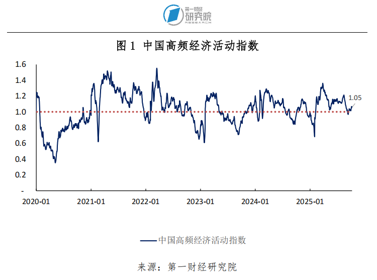 2025年10月7日第一财经研究院中国高频经济活动指数(YHEI)为1.05,较9月30日上升了0.03。截至10月7日的一周,受假期因素影响,“8城市地铁流量指数”上升了0.05至1.20。工业相关指标“沿海煤炭运价指数”和“进口干散货运价指数”分别在本周上升了0.07和0.13。