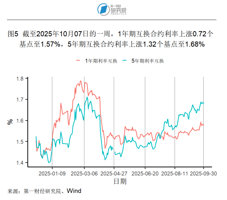 截至10月7日的1年期互换合约利率在过去一个月上升3个基点至1.57%,较去年同期下降7个基点。5年期互换合约利率在过去一个月上升4个基点至1.68%,较去年同期下降16个基点。