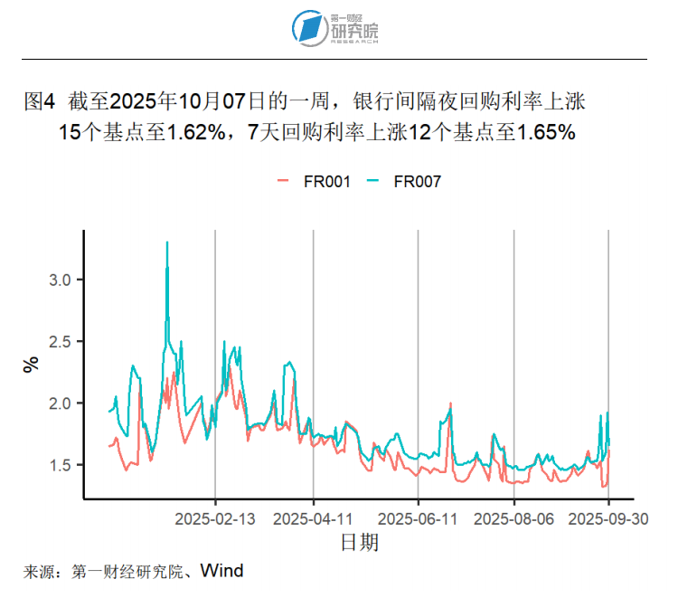 截至10月7日的银行间隔夜利率在过去一个月上升25个基点至1.62%,较去年同期下降21个基点。七天回购利率在过去一个月上升19个基点至1.65%,较去年同期下降75个基点。