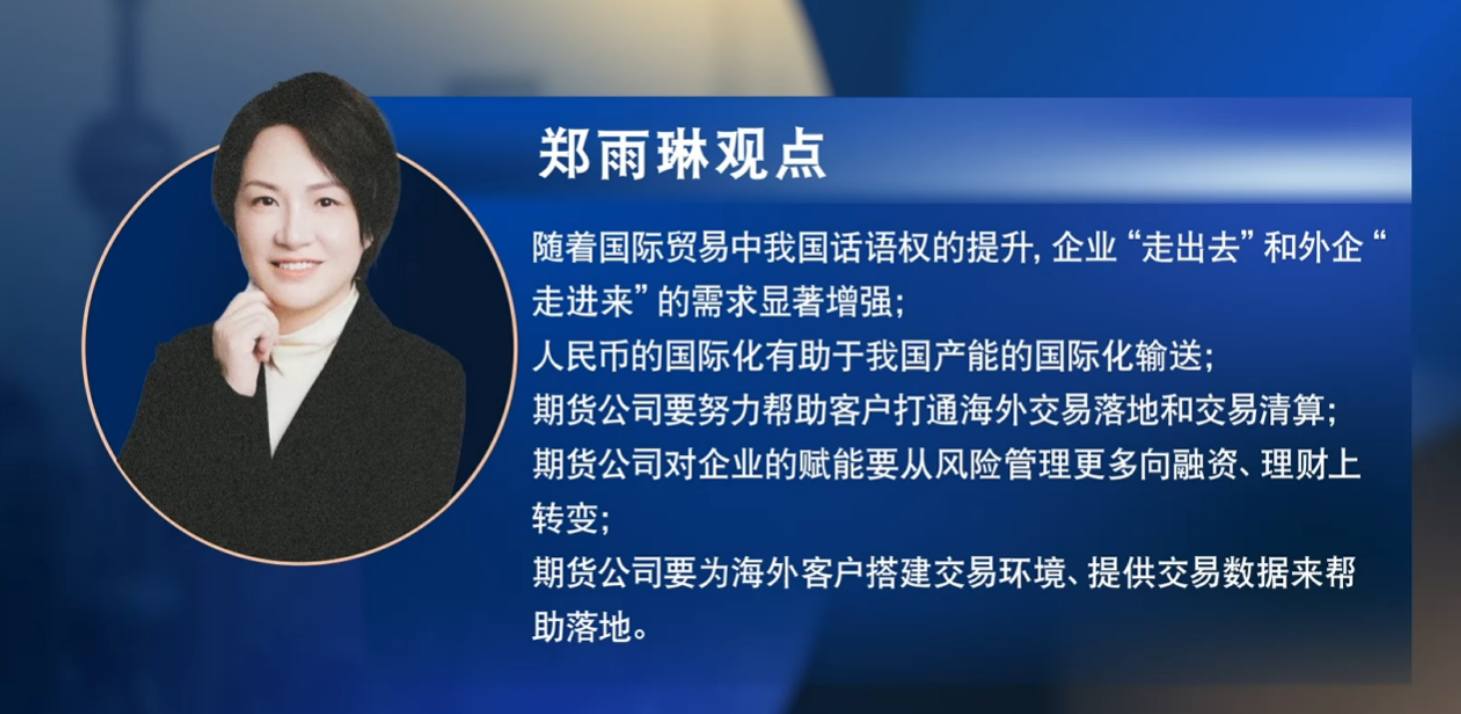中信期货有限公司上海分公司总经理郑雨琳指出,依托中国大宗进口与消费大国的地位,期货国际化须以人民币跨境循环为支点,助力产能出海、外资进场。中信期货正从三方面发力:一是在服务实体经济的过程中,逐步把企业风险管理升级为“融资+理财”综合赋能;二是为外商独资企业、合格境外投资者搭建交易环境、共享数据与策略,实现“走出去”与“引进来”互促;三是直面跨境信用、合规、文化冲突等复杂风险,明确战略定位,补齐人才与技术短板,提供深度定制服务,在激烈国际竞争中锻造金融赋能产能的新优势。