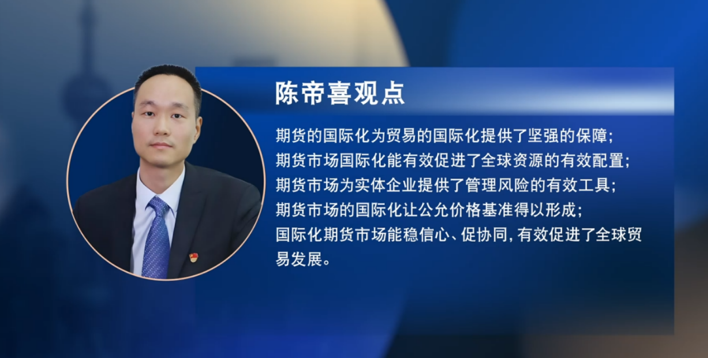 江铜国际贸易有限公司总经理陈帝喜指出,期货国际化与贸易国际化相生相伴:期货国际化通过促进全球资源的有效配置、为实体企业提供管理风险的有效工具、促进公允价格基准形成,为我国贸易国际化提供了坚强的保障。近年来,通过在交易端引入境外投资者、在结算端允许外币保证金、在交割端创新保税模式,三箭齐发让大宗商品国际贸易规模迅速发展,为我国大宗商品“走出去”和全球贸易往来铺设了高质量的金融基础设施。