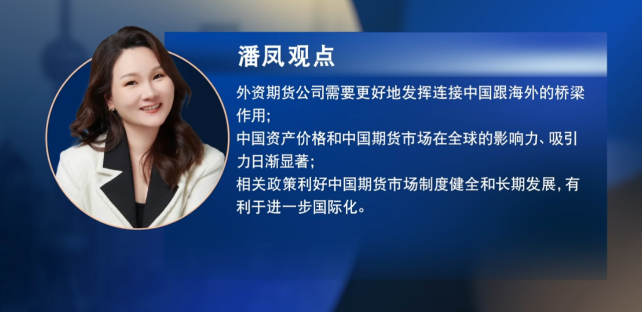 有关期货公司如何升级国际化服务,从而吸引更多境外投资者的话题中,潘凤指出,外资期货公司要把“引外资”做成长期工程:发挥好桥梁作用,把中国规则讲透,把外资信心筑稳;再把全球熟手请进来,打造通晓多国规则、有国际化视野的本土期货人才梯队;同时持续升级打通跨境链路,让海外资金一键接入,质效并举升级国际化服务,吸引全球投资者,也要重视帮助中国企业“走出去”。同时潘凤也希望可以引进海外成熟的、符合监管标准的衍生品工具,更好地发展衍生品市场。