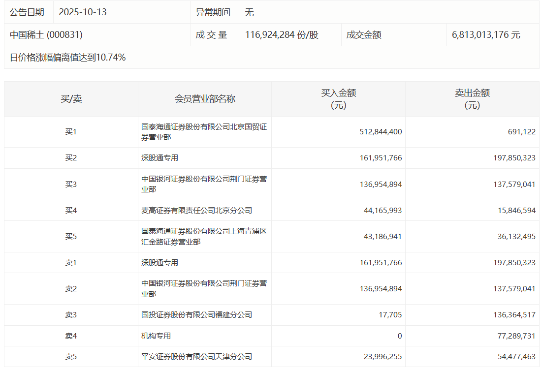 中国稀土今日涨停,成交额68.13亿元,换手率11.02%。盘后龙虎榜数据显示,深股通专用席位买入1.62亿元并卖出1.98亿元,有1家机构专用席位净卖出7728.97万元。国泰海通证券北京国贸营业部席位净买入5.12亿元。