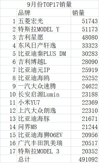 五菱宏光MINI EV卖了51743辆,和特斯拉Model Y双双成为今年首度月销超过5万辆的车型。特斯拉Model Y9月交付51173辆,成为TOP 10里唯一超过20万元级别的车型。8月的销冠吉利星愿交付了46057辆,销量较上月微增2023辆,但本月排名来到第三。