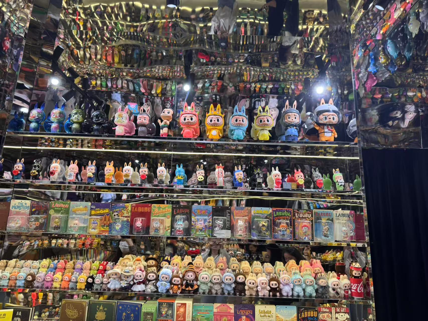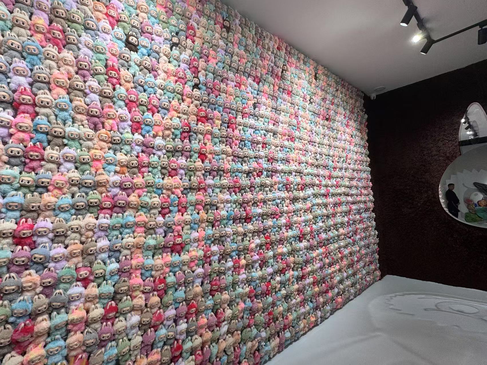 展区内不仅有龙家升亲自在墙上画出的LABUBU手稿,还有挂满约2000只LABUBU的墙,都吸引了不少参观者拍照。此外,在展区的最后一个环节,陈列了自2015年以来几乎所有上市的LABUBU相关产品,包括一些罕见的隐藏款。