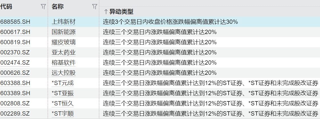 *ST美谷、*ST万方、*ST南置等连续三个交易日涨跌幅偏离值累计达到12%。