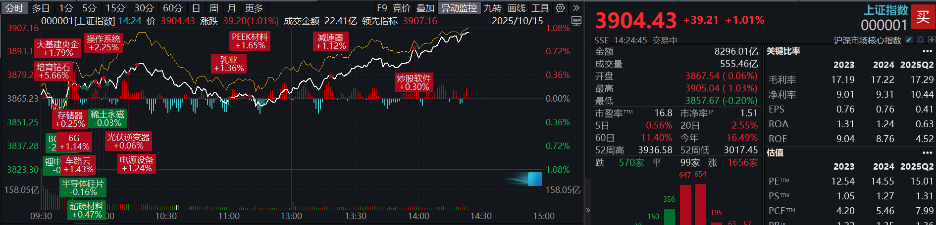 算力产业链集体反弹,CPO、铜连接方向领涨;新消费、固态电池、创新药、AI手机、金融科技概念股活跃。市场近4000股上涨。