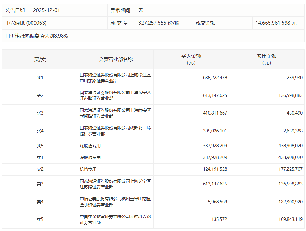 中兴通讯今日涨停,国泰海通上海中山东路大额买入