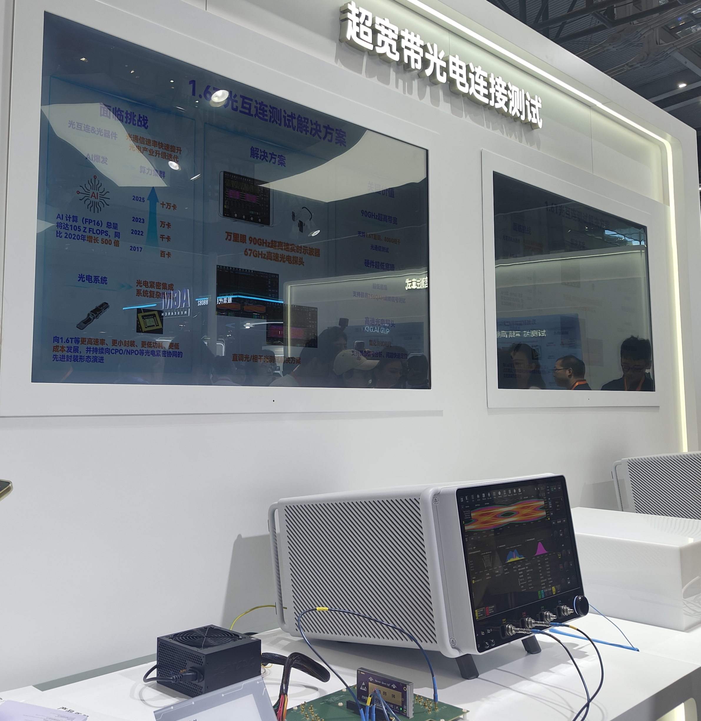 今年8月,万里眼示波器通过CNAS认证,是国内唯一具备80GHz带宽示波器计量资质的单位,该公司的示波器已在华为、上海交大等企业或科研单位应用和测试。万里眼展台人员告诉记者,90GHz产品已经量产,公司收到订单后开始制造,货期5~8周。目前1.6T的光模块需要用到90GHz带宽的示波器,随着光模块等技术演进,90GHz示波器也将会不够用,公司的示波器产品会继续迭代,未来将推出更大带宽的产品。