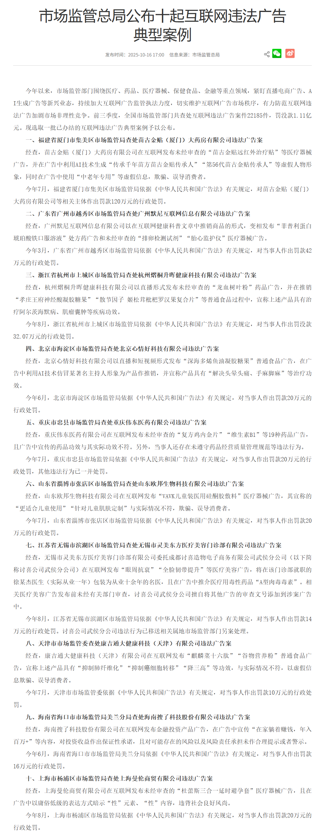 据市场监管总局消息,今年以来,市场监管部门围绕医疗、药品、医疗器械、保健食品、金融等重点领域,紧盯直播电商广告、AI生成广告等新兴业态,持续加大互联网广告监管执法力度,切实维护互联网广告市场秩序,有力防范互联网违法广告加剧市场非理性竞争。前三季度,全国市场监管部门共查处互联网违法广告案件22185件,罚没款1.11亿元。现选取一批已办结的互联网违法广告典型案例予以公布。