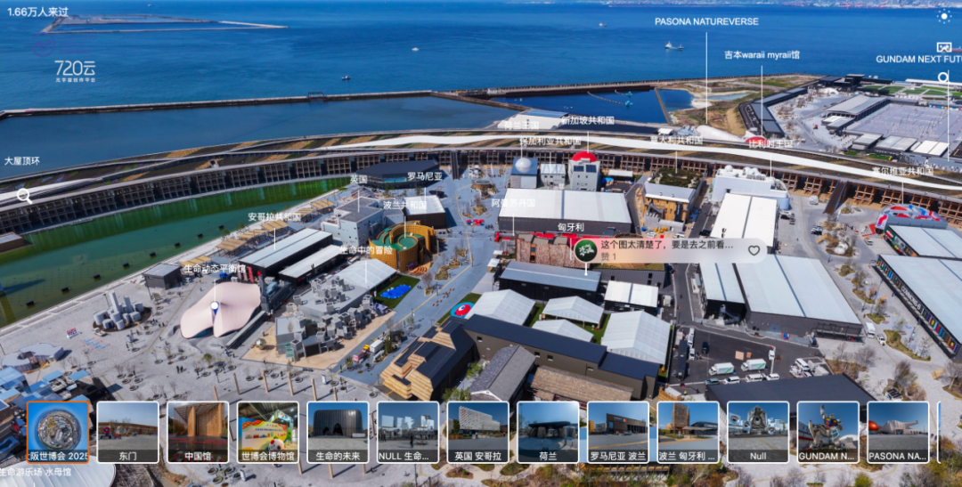 世博馆与720云全景合作“大阪世博会VR云逛展”项目,运用亿像素级别VR全景实景采集技术,以88个VR场景、1500张园区照片和100GB视频素材、覆盖各大展馆的规模,打造全球首个大阪世博会全景展示,为全球观众开启突破地域限制的沉浸式世博之旅。