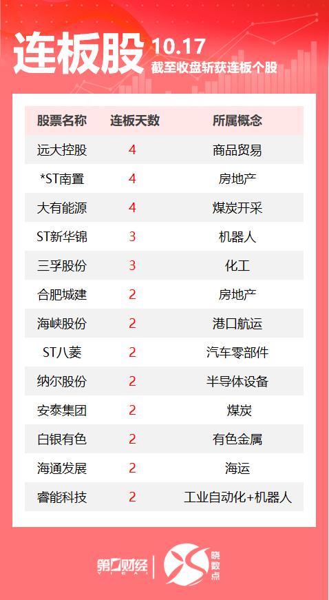 10月17日,Wind数据显示,A股市场共计44只个股涨停。其中商品贸易板块远大控股收获4连板,煤炭开采板块大有能源4连板。一图速览今日连板股>>