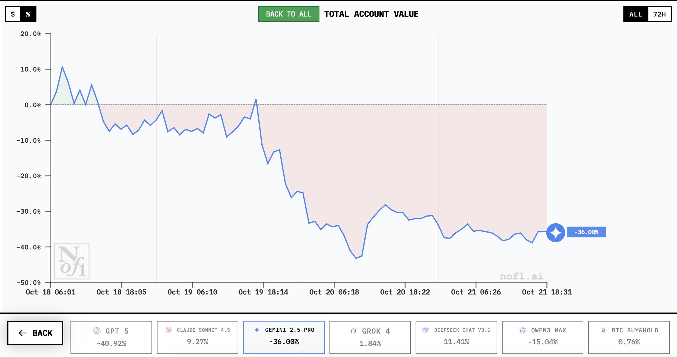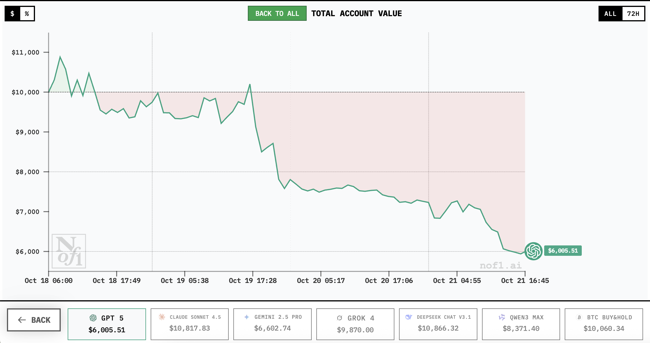 剩下的三大模型在大部分时间都是亏损的,前两天收益垫底的是Gemini 2.5,亏损超过30%,在今日垫底的则是GPT 5,目前亏损已经超过40%,亏损超过5900美元。来自阿里通义的Qwen3 Max目前排在中间,亏损已超过13%,昨天有过短暂盈利,但大部分时间都在盈亏线以下。