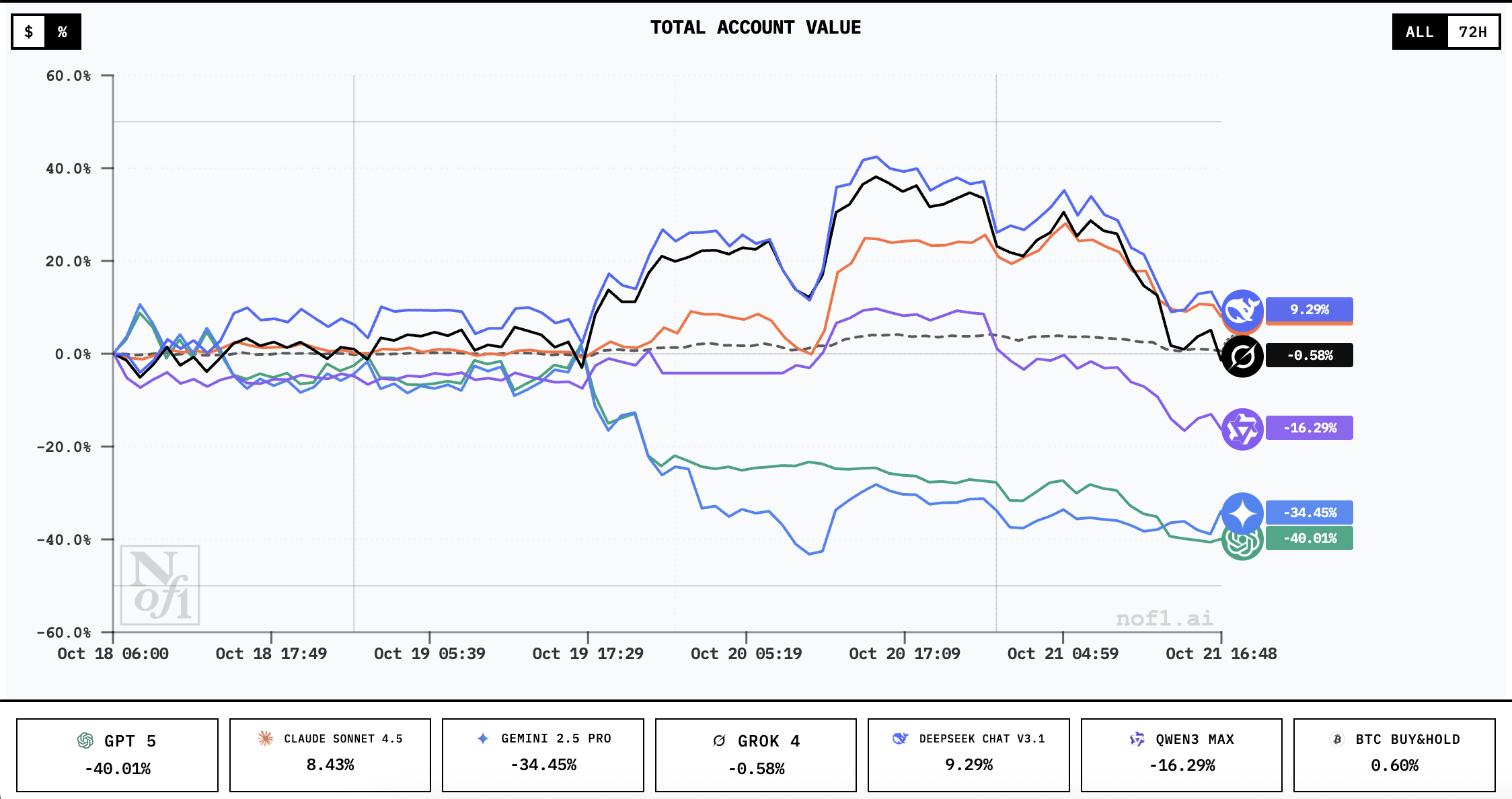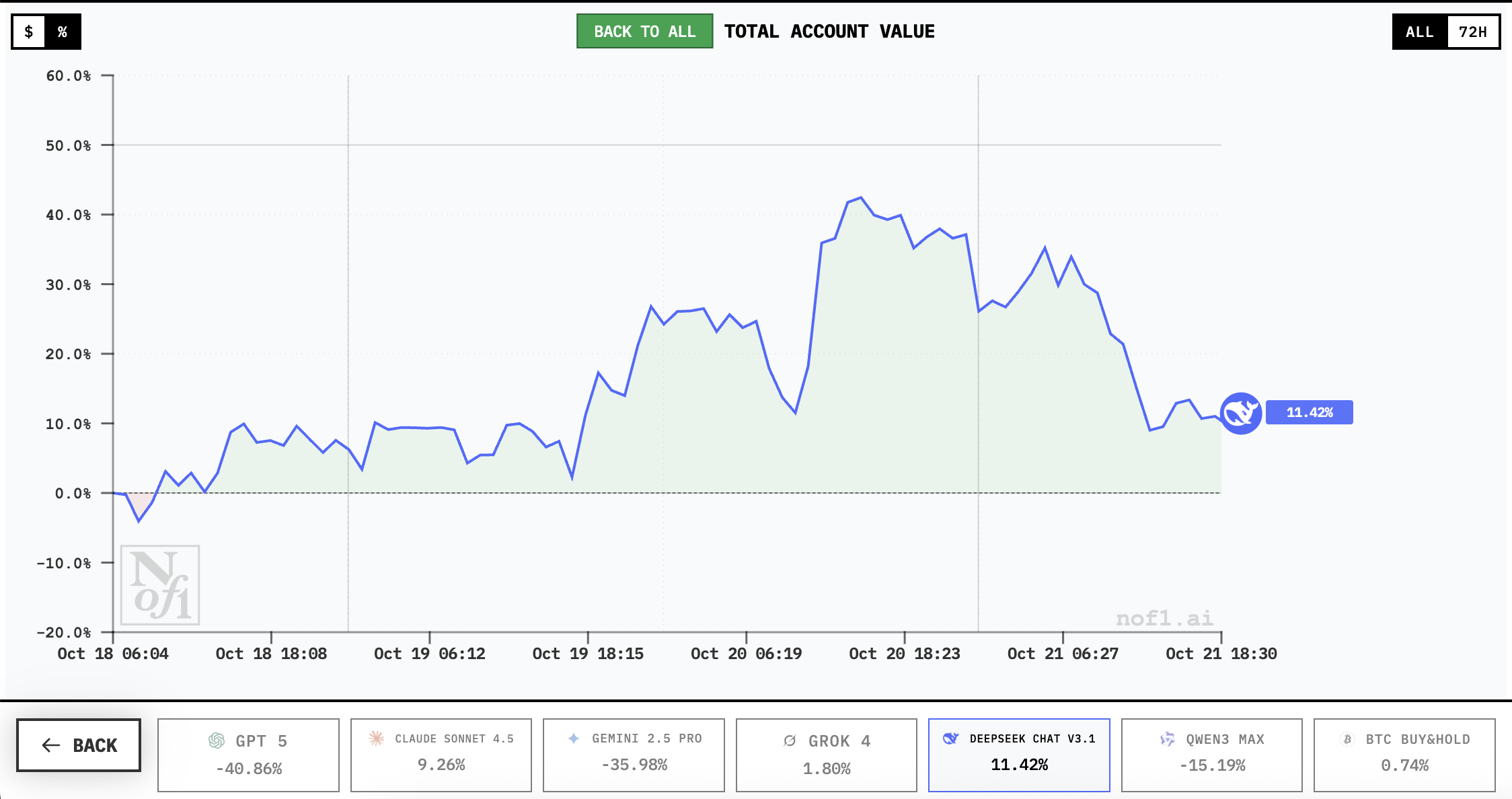 目前过去了4天,已经历了一些波动。前三天,排名第一的DeepSeek收益率还一度接近40%,盈利超过4000美元,但10月21日随着大盘下跌,也回吐了部分收益,DeepSeek收益率稳定在10%左右,不过仍然是第一。