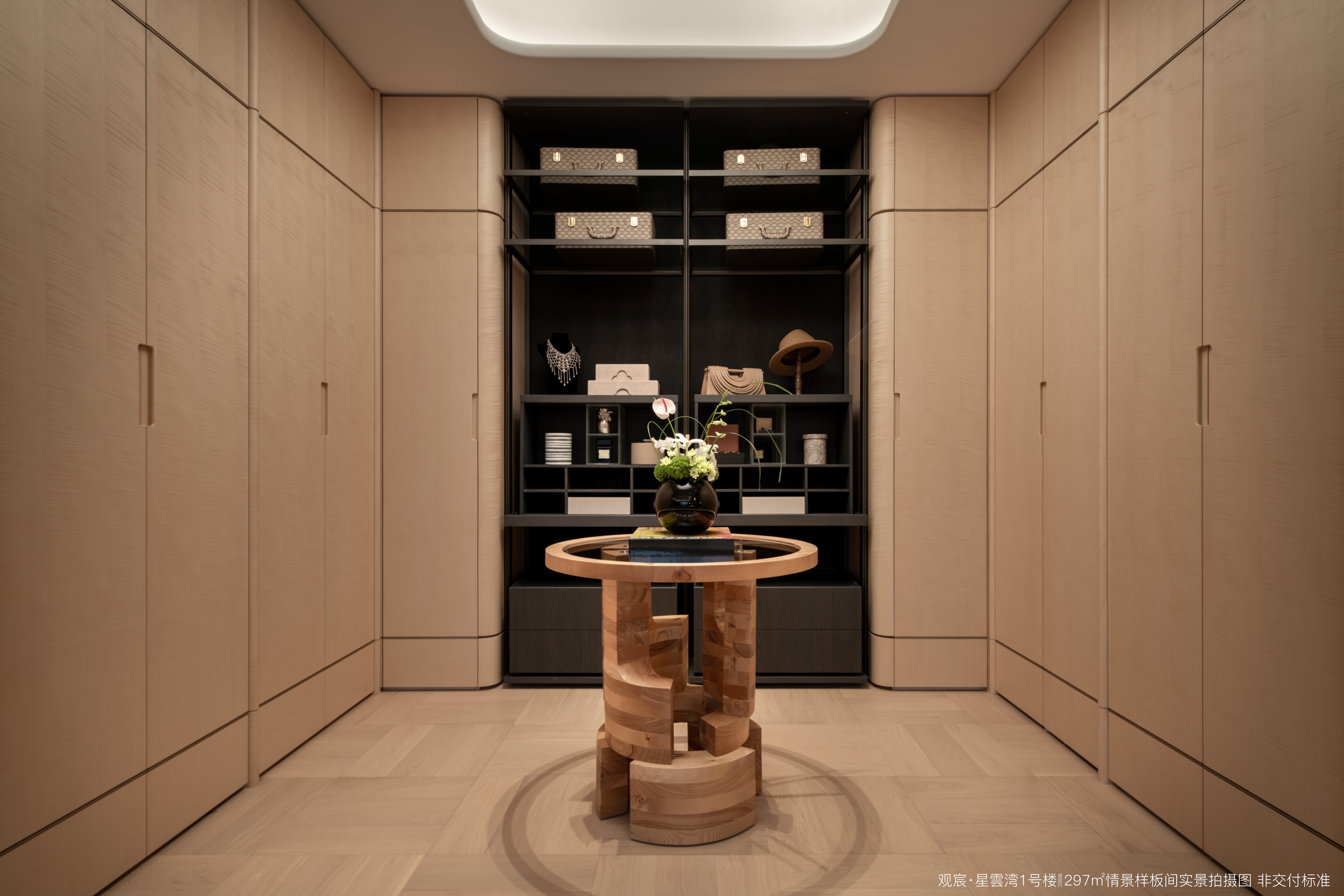 观宸选择化繁为简,摒弃故作深沉的暗调或撞色的视觉刺激,突出美洲枫木的低饱和色调、白木纹大理石的天然纵横纹路,展现材质本身“温润的高级感”,并以造型上的细节变化,丰富空间感受,达成一种毫不费力的温和雅致的高级感。