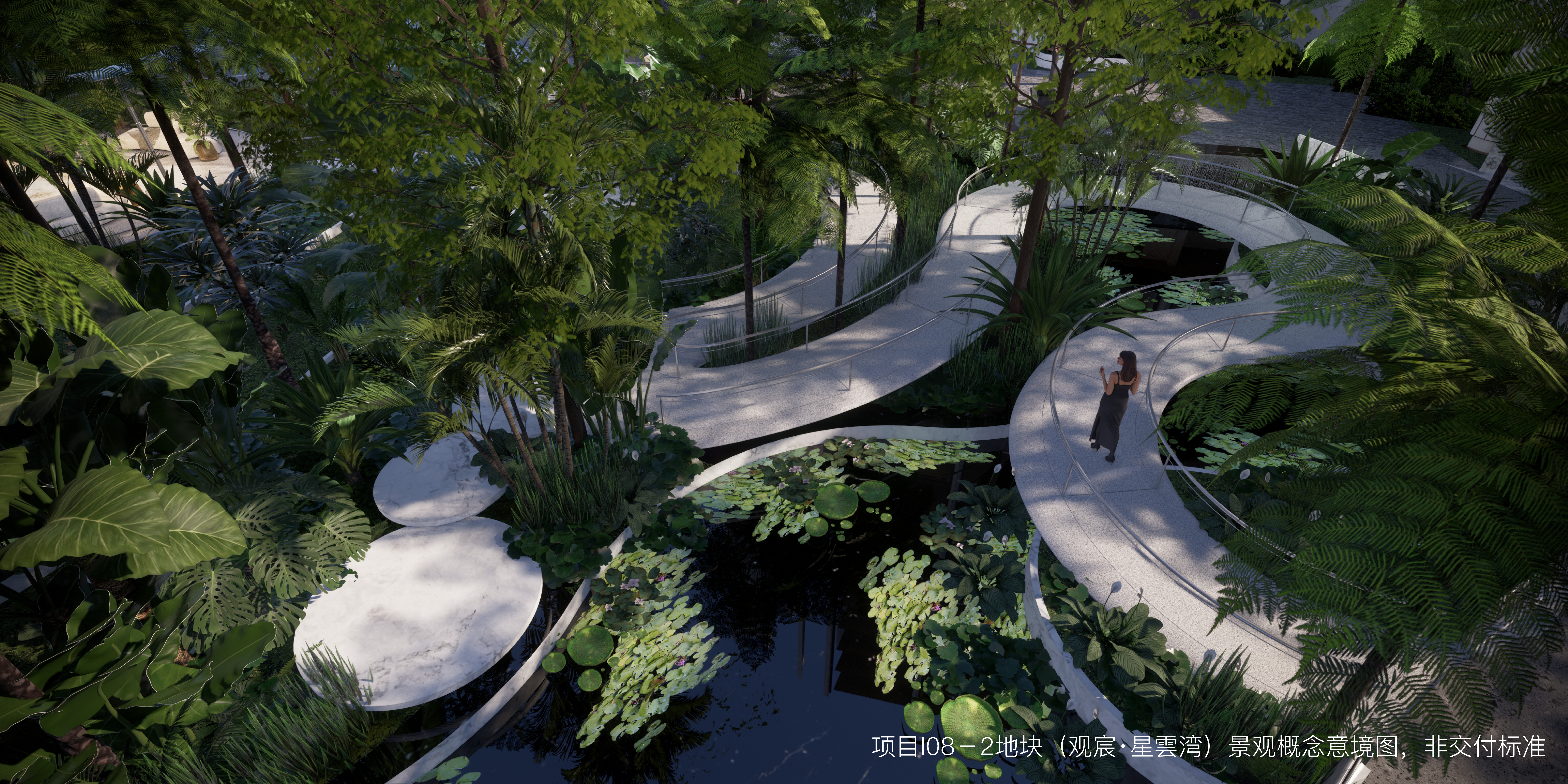观宸在此方面亦有独特的思考。项目秉承“占地即绿地”的理念,以“雨林游踪”为主题,引入多种雨林植物与水景,通过连续的秘境廊桥,营造出秘林游踪的沉浸式体验。空中花园、丛林绿谷、悬崖飞瀑等节点的设置,实现了移步易景,让家园成为治愈身心的城市绿洲。