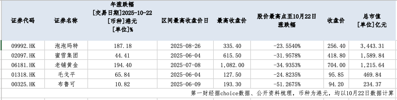 板块内其他个股同样走势疲软。老铺黄金自10月17日触及846港元/股的阶段高点后持续回落,截至10月23日已跌至692港元,区间跌幅超18%。自7月8日创下的1082港元历史高点以来,该股累计跌幅已超34.93%。蜜雪集团自6月4日冲到615港元的高点至今,回调幅度更超过31%。