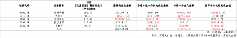 近期资金流向揭示了内外资机构在新消费板块上的鲜明分歧。以持股数量变化*最新日成交均价估算,Wind数据显示,尽管南下资金仍是做多主力,向5家概念股净流入33.37亿港元;但其他主要机构投资者均在撤退,中资、国际与香港本地中介分别净流出14.66亿港元、13.66亿港元和2.16亿港元。