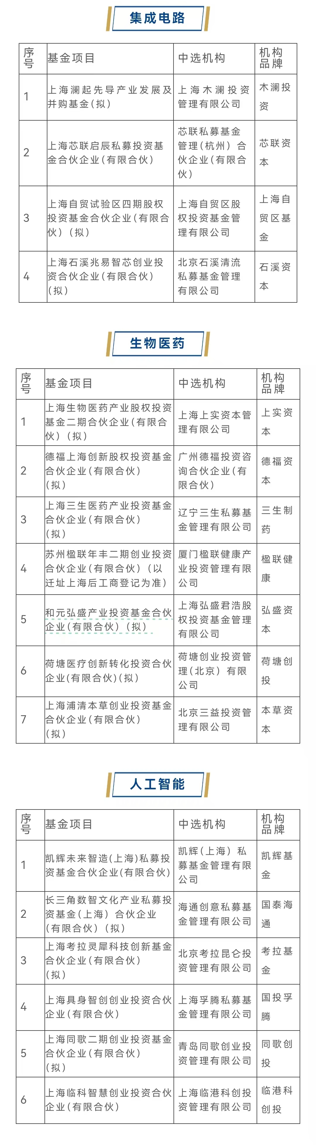 上海三大先导产业母基金第三批子基金遴选结果公示