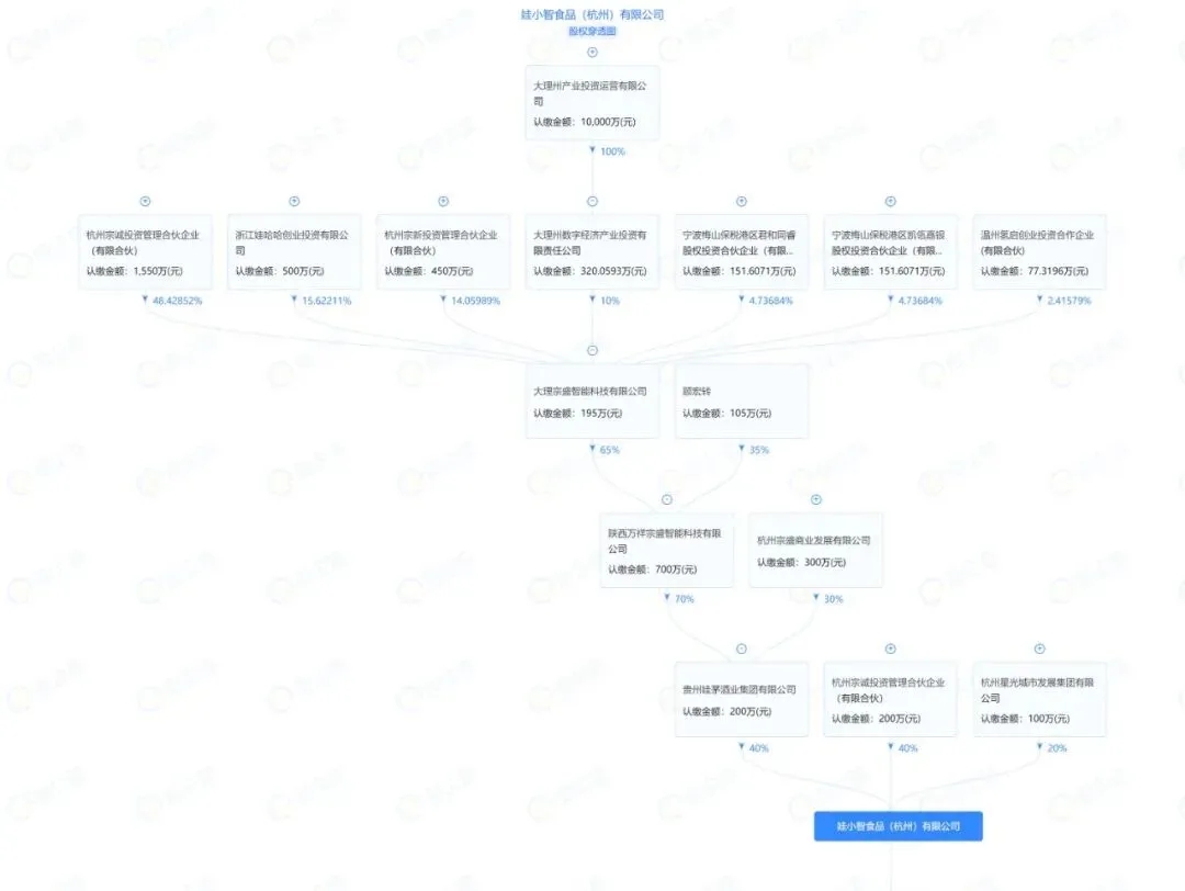 公众号还透露,娃小智的前身是大理宗盛智能科技有限公司(背后为大理州数字经济产业投资有限责任公司控股)。 大理与大连两地国资基于对娃哈哈品牌力及宗庆后先生的影响力下,投入巨资。娃小智食品(杭州)有限公司的股权向上穿透后,核心股东之一为贵州娃茅酒业集团有限公司。