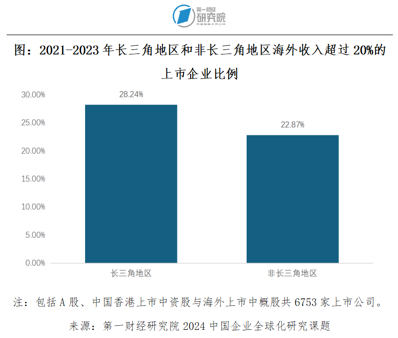 样本企业在全球化发展方面的成就与长三角地区整体的发展环境有关。基于课题组对中国上市公司全球化情况的跟踪研究,横向与全国其他区域的上市企业对比,长三角地区企业整体在开拓海外市场方面有着良好的表现。从数据来看,我们梳理了包括A股、中国香港上市中资股与海外上市中概股共6753家中国上市企业的全球化表现。其中,位于长三角地区的上市企业中有28.24%的企业2021-2023年平均海外收入占比超过了20%;而全国其他地区的上市企业中,仅22.87%的企业在这三年平均海外收入占比超过了20%。课题组认为,海外收入占比超过20%意味着企业在全球化发展方面已经取得了一定的成就。