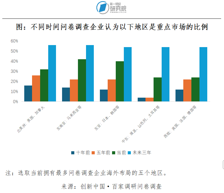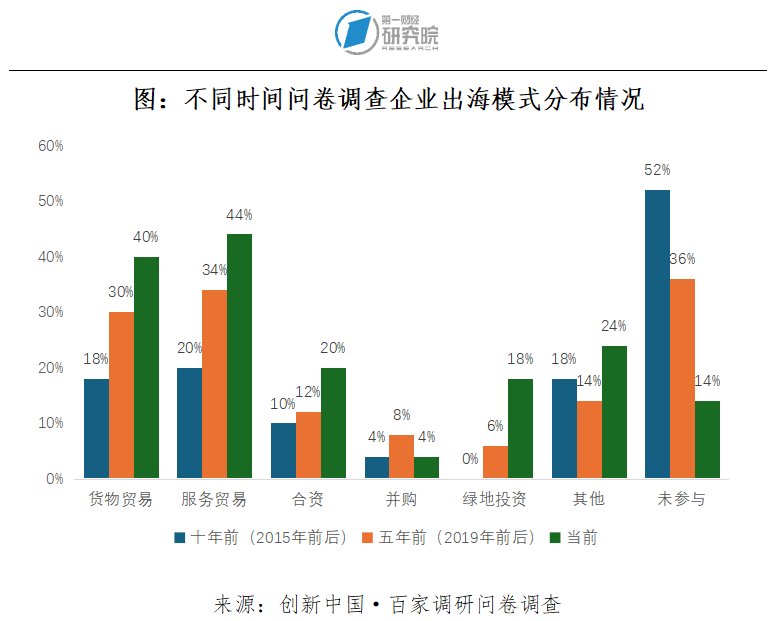 我们观察了十年前(2015年前后)、五年前(2019年前后)以及当下(2024年末)三个时间点的创新中国·百家调研问卷调查企业出海模式的变化情况。