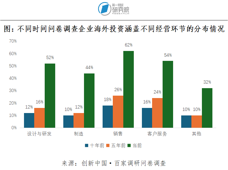 近十年中,问卷调查企业对绿地投资的关注度有所增强。绿地投资,即新建投资,其定义是“跨国公司等投资主体依据东道国的法律,在东道国境内设立部分或全部资产所有权归外国投资者所有的企业”。普遍而言,新建固定资产,如厂房、设备等都属于绿地投资。在调查问卷观察的三个时间点中,十年前没有问卷调查企业参与绿地投资,而当下18%的问卷调查企业进行了绿地投资。我们在创新中国·百家调研现场访谈中发现,企业在海外开展绿地投资的原因各异。