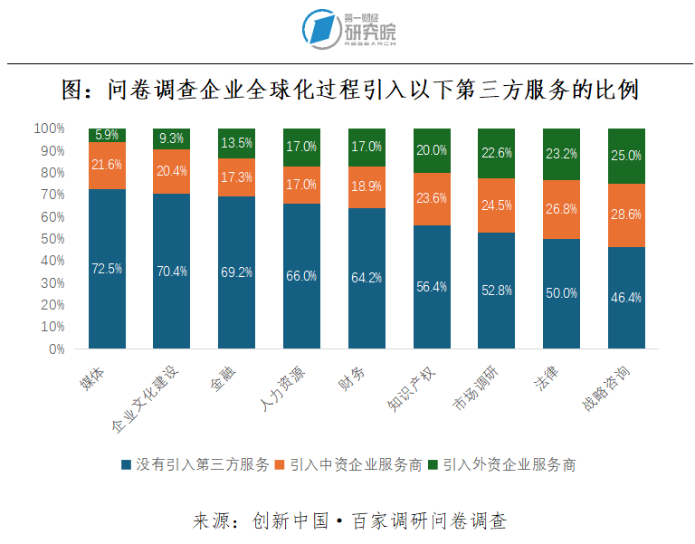 普遍而言,设立海外实体是企业深度融入全球市场不可或缺的举措之一。比如,样本企业天合光能拥有着覆盖180多个国家的销售和服务网络,在中国、新加坡和西班牙拥有多个研发中心,并在全球范围内建立了多个生产基地。而企业的海外经营却是复杂的,在此过程中往往少不了其他服务行业的支持。创新中国–百家调研问卷调查显示,不少企业在全球化过程中采用了第三方的服务,服务类型主要包括战略咨询、市场调研、财务、金融、媒体、人力资源、法律等。