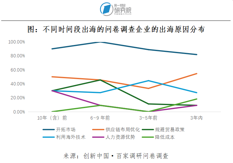 企业出海,意味着面向更大的市场。我们考察了3年内、3至5年前、6至9年前、以及10年(含)前,共计四个时间段内有全球化业务的问卷调查企业的出海动因。我们发现,在每个时间段中,均有超过80%的问卷调查企业将开拓市场视为出海的主要动力。除此之外,在问卷观察的四个时间段中,供应链布局优化以及利用海外技术也是企业出海的重要动力。