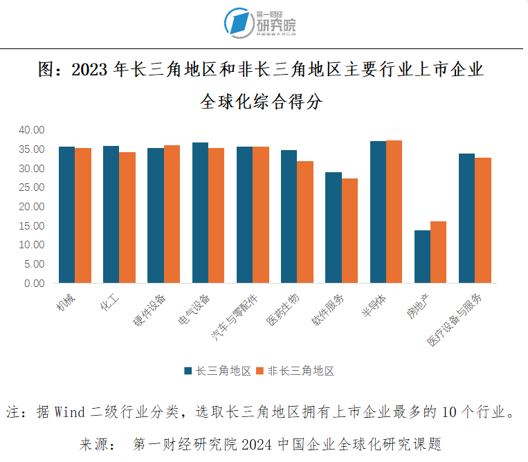事实上,该特点并非是长三角区域特有的。非长三角区域两个行业的上市企业全球化平均总分也都超过了35分。这两个行业的中国上市企业普遍拥有良好的全球化表现。