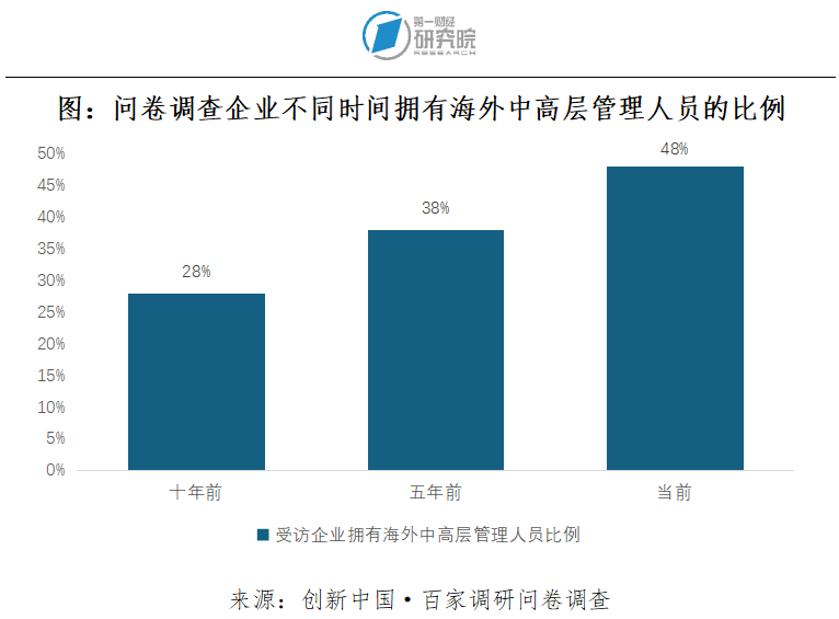 值得一提的是,创新中国·百家调研问卷调查显示,当前48%的问卷调查企业都拥有海外中高层管理人员。