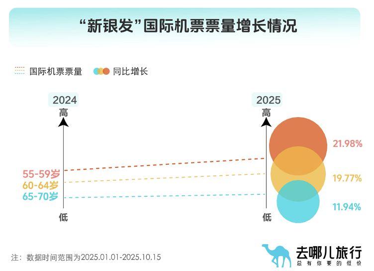 近年来,“新银发一族”的出行频率和距离都在提高。根据去哪儿旅行今日发布的《2025“新银发一族”飞行报告》,截至目前,55周岁至70周岁的“新银发一族”今年乘坐飞机打卡了全国255个城市,国际机票的订单量更是同比增长19%,飞往了境外1452个城市,比去年增加110个目的地。