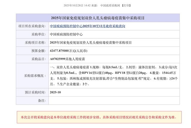 随着HPV疫苗纳入国家免疫规划,10月28日下午,中国政府采购网公布了2025年国家免疫规划双价人乳头瘤病毒疫苗(即二价HPV疫苗)集中采购项目,预算金额约4.25亿元,数量是1544.65万,这意味着单支价格不超过27.5元。