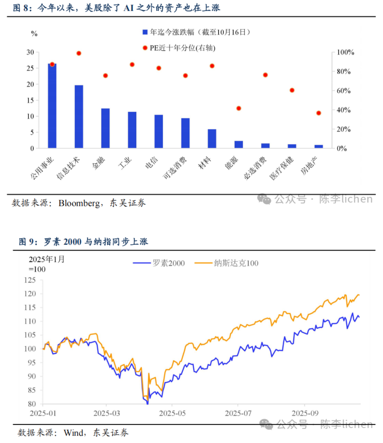 人工智能的快速发展,产业资本支出连续大幅攀升,推动了硬科技行业快速成长。但这不是这场全球资产价格上涨的全部内容,甚至不是主要动力。除了人工智能相关行业,仔细观察会发现,金融、消费、房地产等传统行业的股票同样在上涨。代表中小企业的罗素2000指数与科技股集中的纳斯达克100指数同步上扬,说明当前行情不是某个特定产业驱动的,而是整体性的资金流入。