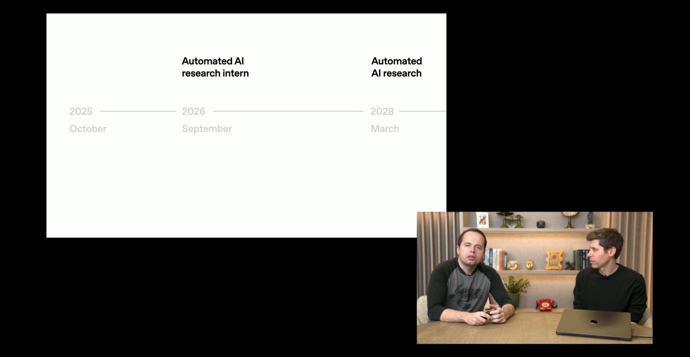 在直播中,OpenAI回应了业界关注的一些问题,首次公开了内部研究目标的具体时间表和路线图,包括“在2028年3月实现完全自主的AI研究员”,同时他们认为,深度学习带动下距离超级智能“可能不到十年”,这里超级智能指的是在大量关键领域都比人类更聪明的系统。